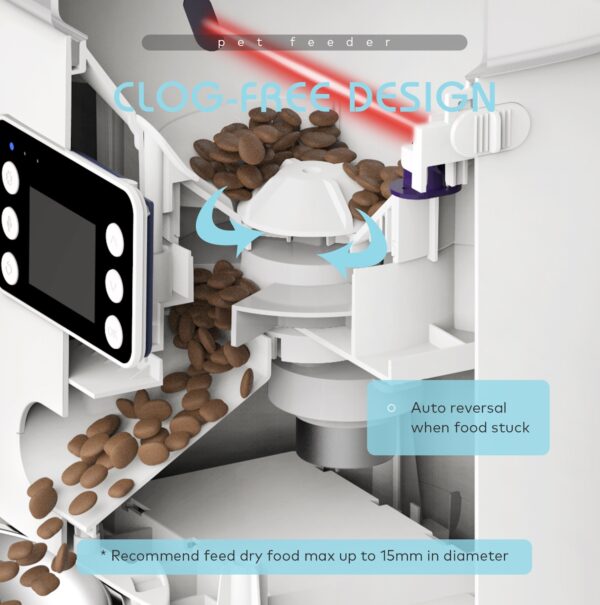 - 6Liters hopper with dry food maximum up to 15mm in diameter